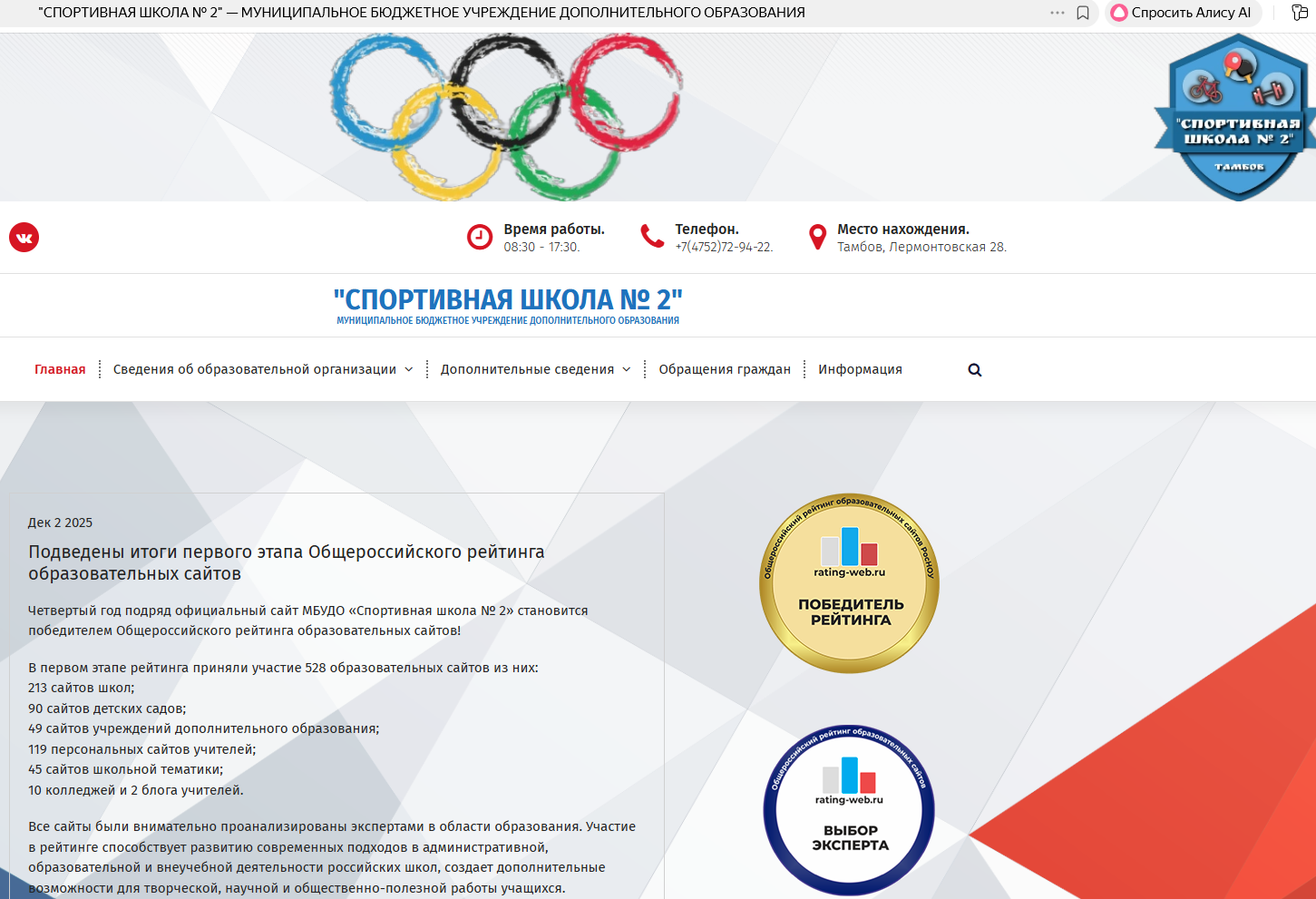 Четвертый год подряд официальный сайт спортивной школы №2 Тамбова входит в число победителей Общероссийского рейтинга образовательных сайтов.