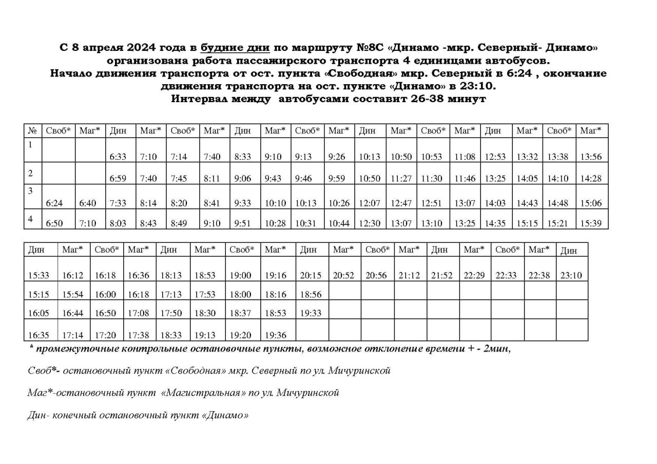 Количество транспорта на маршруте №8С планируется увеличить с двух единиц до четырех. Обновленное расписание автобусов №8С начнет действовать с понедельника, 8 апреля.