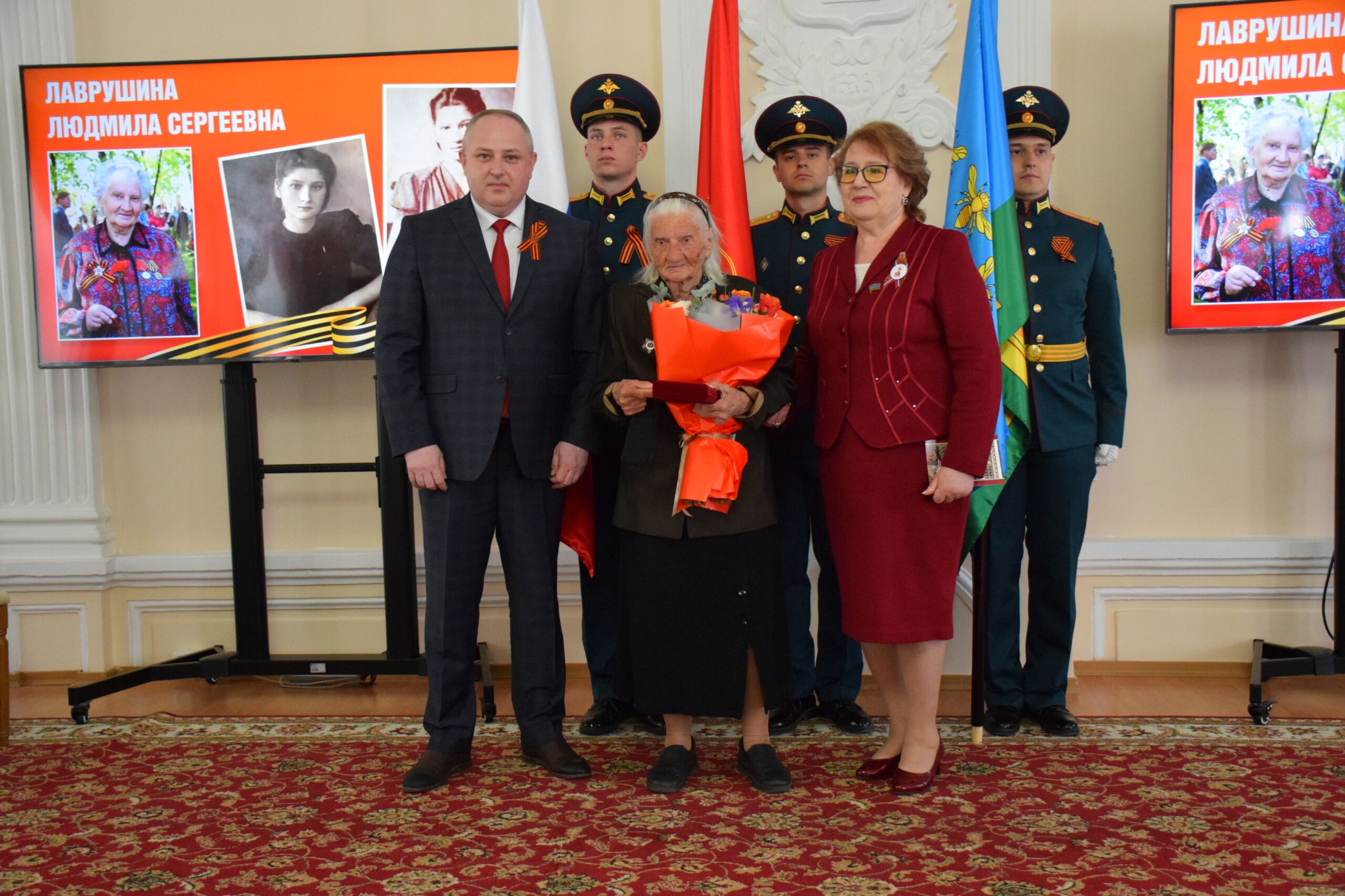 Не все из них по состоянию здоровья смогли лично принять участие в торжественной церемонии. Среди тех, кто прибыл на чествование, – Людмила Сергеевна Лаврушина. Ей было всего 14 лет, когда ее с матерью зачислили в штат эвакогоспиталя, который располагался в здании школы №6 Тамбова. В 1943 году госпиталь убыл на фронт. Люда помогала медработникам ухаживать за ранеными солдатами. В 1945 году она вернулась в Тамбов. Людмила Сергеевна принимает активное участие в городских мероприятиях, во встречах с молодежью. Награждена орденом Отечественной войны II степени, медалью «За Победу над Германией в Великой Отечественной войне 1941-1945 гг.».