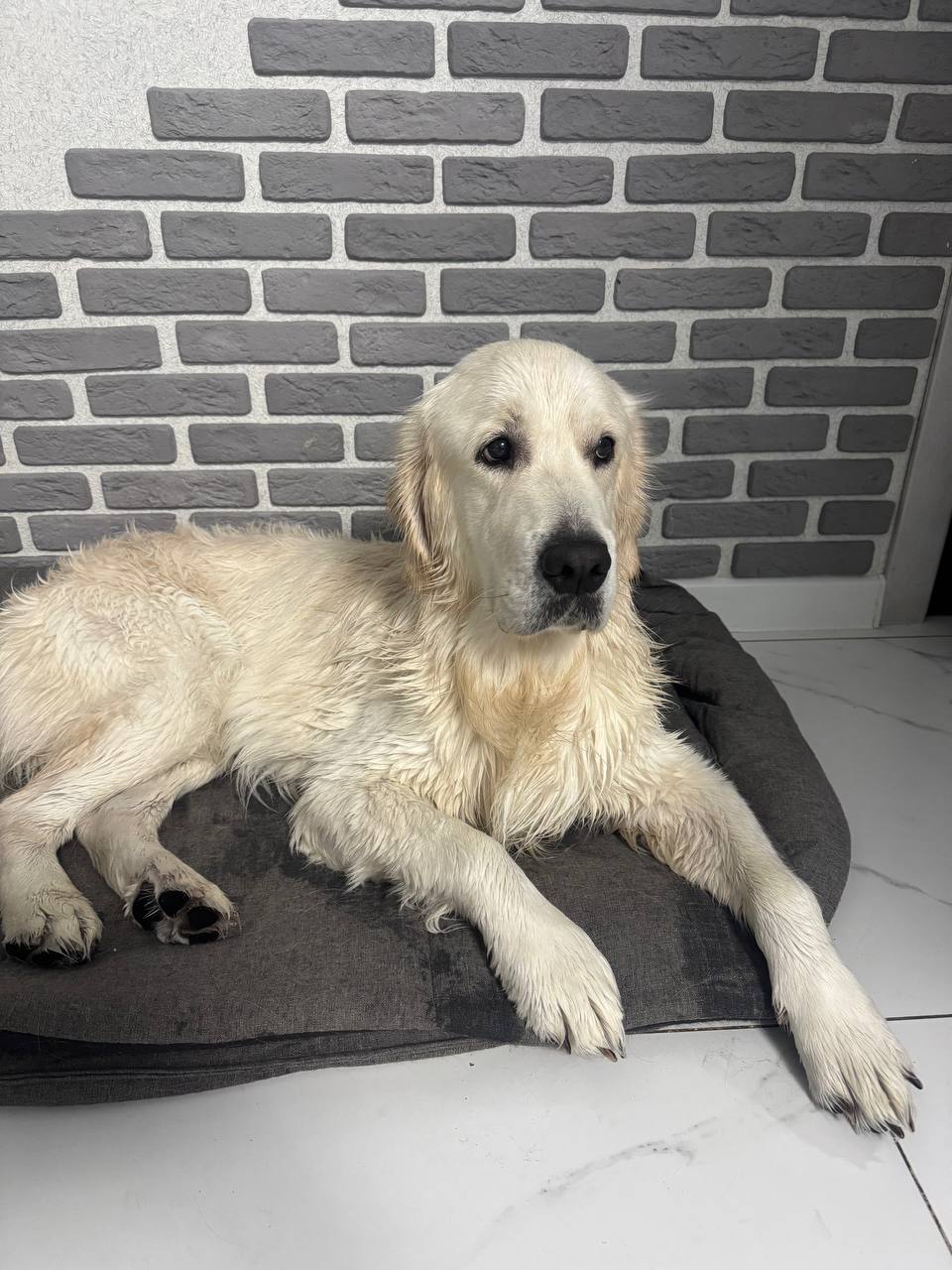 Белого ретривера Лео подобрали на трассе неравнодушные люди.