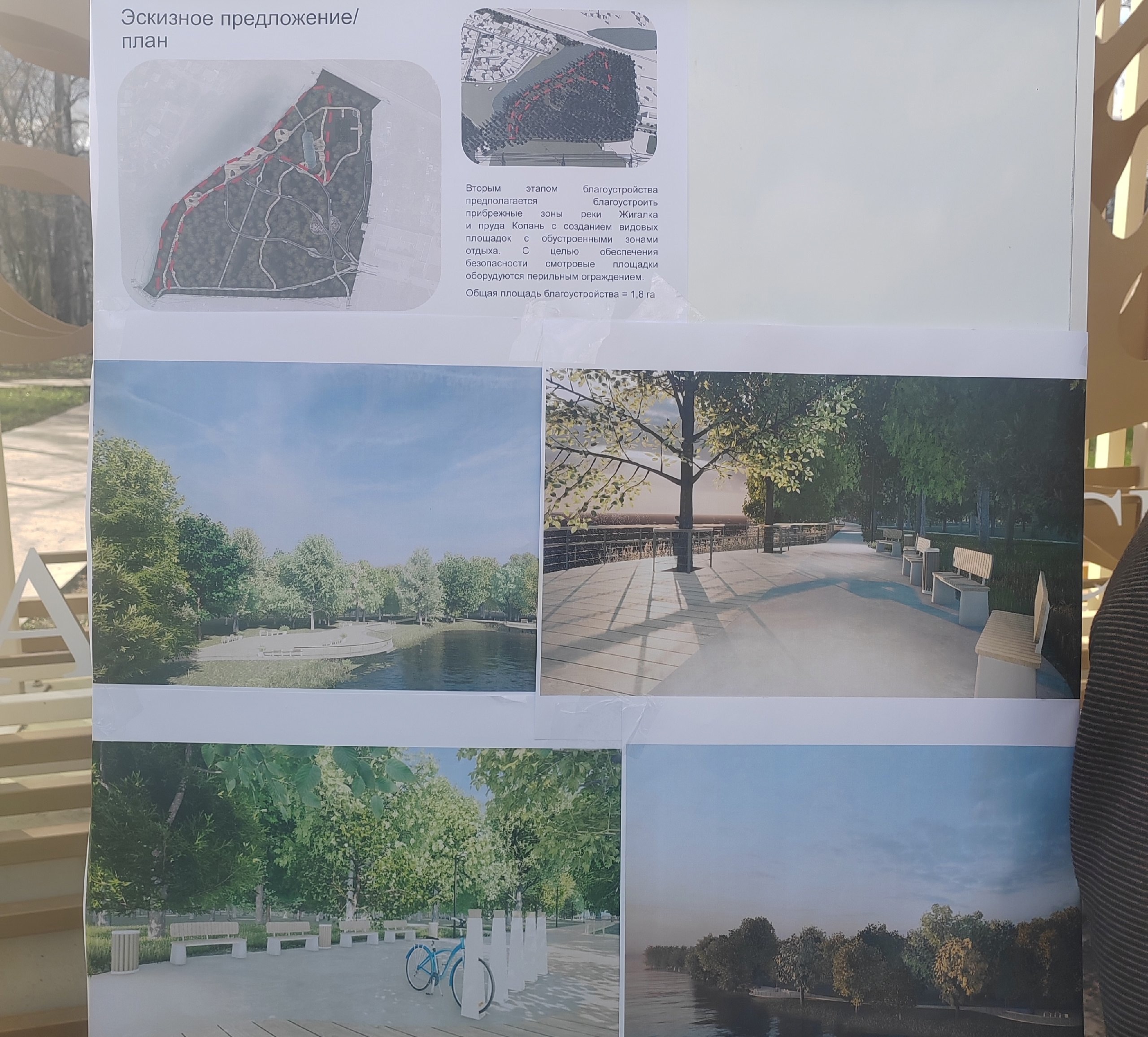 Как сообщила главный архитектор города Тамбова Яна Ломко, предлагается благоустроить береговую линию Жигалки с закольцовкой дорожек. Проектом предполагается создание набережной с небольшими смотровыми площадками на каркасе и организацией мест отдыха. Общая площадь благоустройства – 1,8 га.