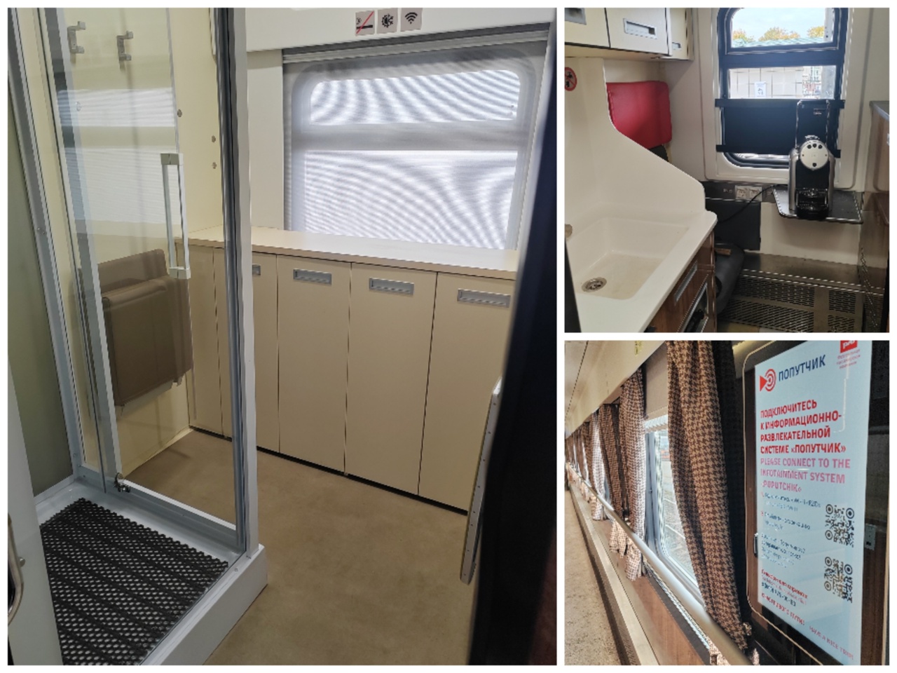В служебном купе размещены просторные шкафы для посуды, холодильник, микроволновка и мойка, а также сидение и столик для проводника. Полукупе оснащено верхней и нижней спальными полками, в остальном оно похоже на двухместное купе. В коридоре вагона установлены пурифайер и витрина для пассажиров, в вагоне есть относительно просторная душевая кабинка, в помещении душа также имеется гладильная доска, тумбочка, откидное сидение и установка обеззараживания поверхностей. Для комфортного использования душевой кабины есть дополнительный водонагреватель. Туалет оборудован гигиеническим душем в зоне унитазного модуля, шкафами, мусорным ведром, умывальником и пеленальным столиком. Туалетный комплекс вагона считается экологически чистым.