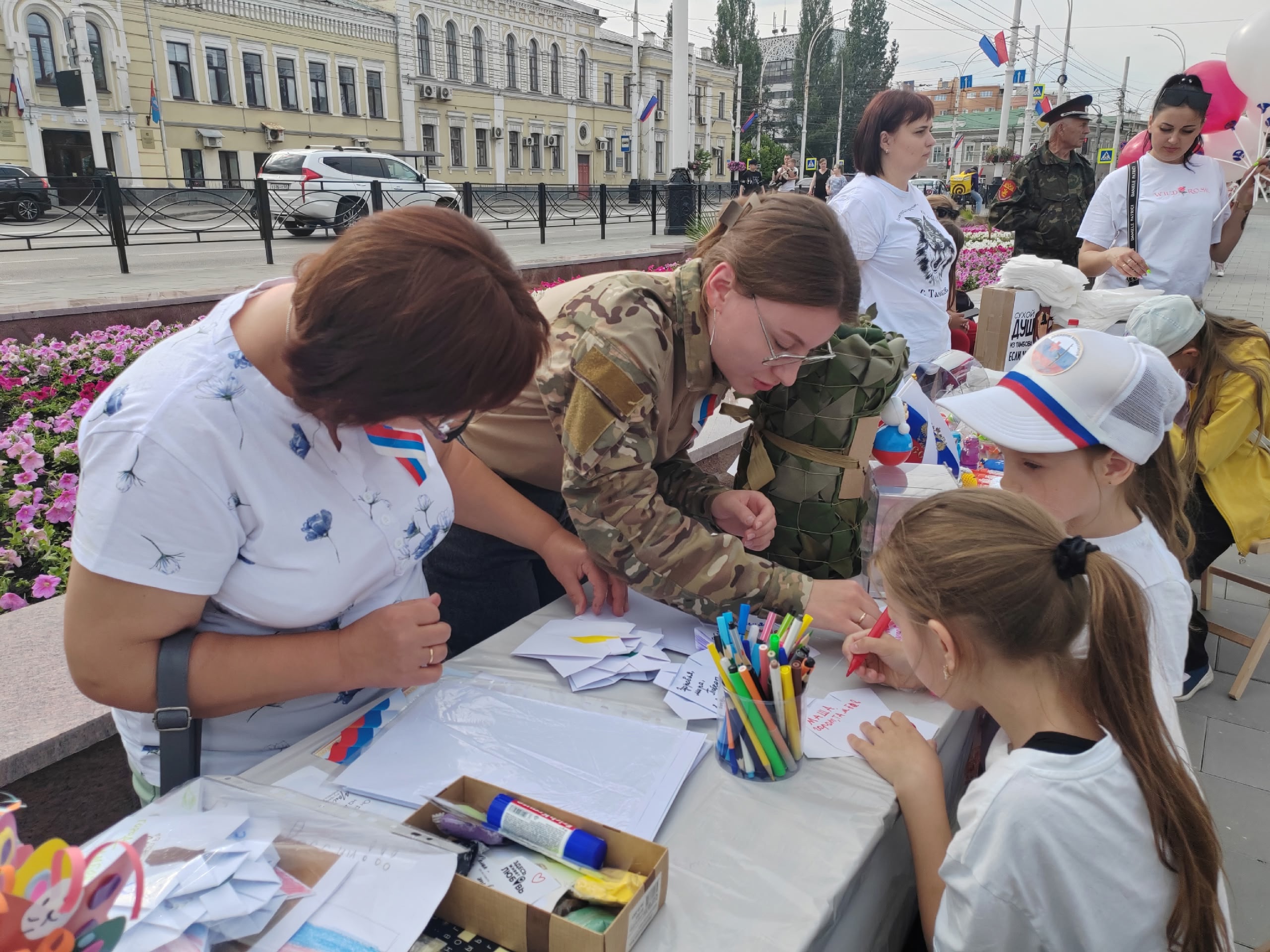 В изготовлении сухих душей и маскировочных сетей активно участвуют тамбовские школьники, они тоже представили результаты своего труда. На празднике любой желающий мог написать письмо солдату или оставить пожелание для бойцов на передовой.