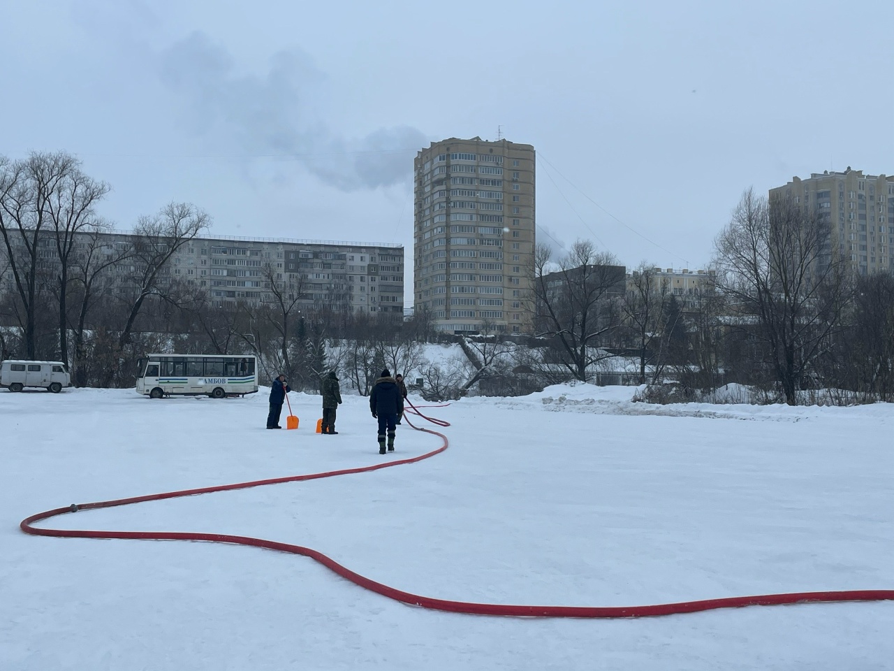 Сегодня в Тамбове начали заливать самый большой уличный каток за Тезиковым мостом. Работники сформировали снежную подушку, а сегодня продолжили проливку водой для создания ровной поверхности.