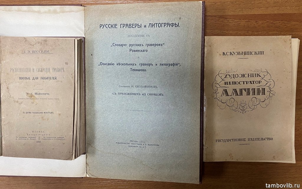 В Тамбовскую областную библиотеку им. А.С. Пушкина переданы 3 старинные издания. Это книги И.Э. Вессели «О распознавании и собирании гравюр» (Москва, 1882), Н.А. Обольянинова «Русские граверы и литографы. Добавление к «Словарю русских граверов» Ровинского и «Описанию нескольких гравюр и литографий» Тевяшова» (Москва, 1913) и К.С. Кузьминского «А.А. Агин, его жизнь и творчество» (Москва-Петроград, 1923).