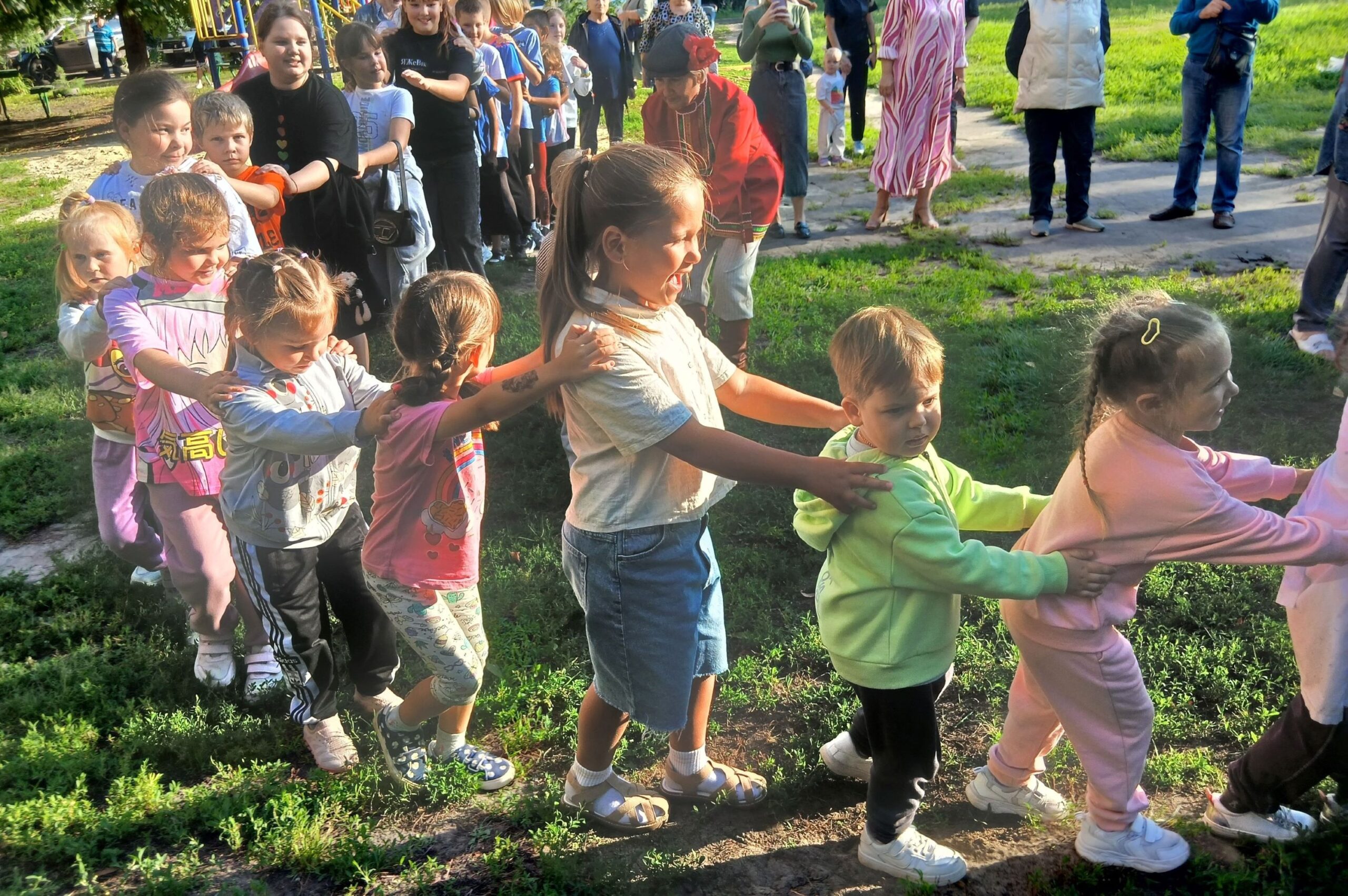 А потом ребятня собралась в целый «медовый паровозик», который увлек всех желающих в поездку по двору.