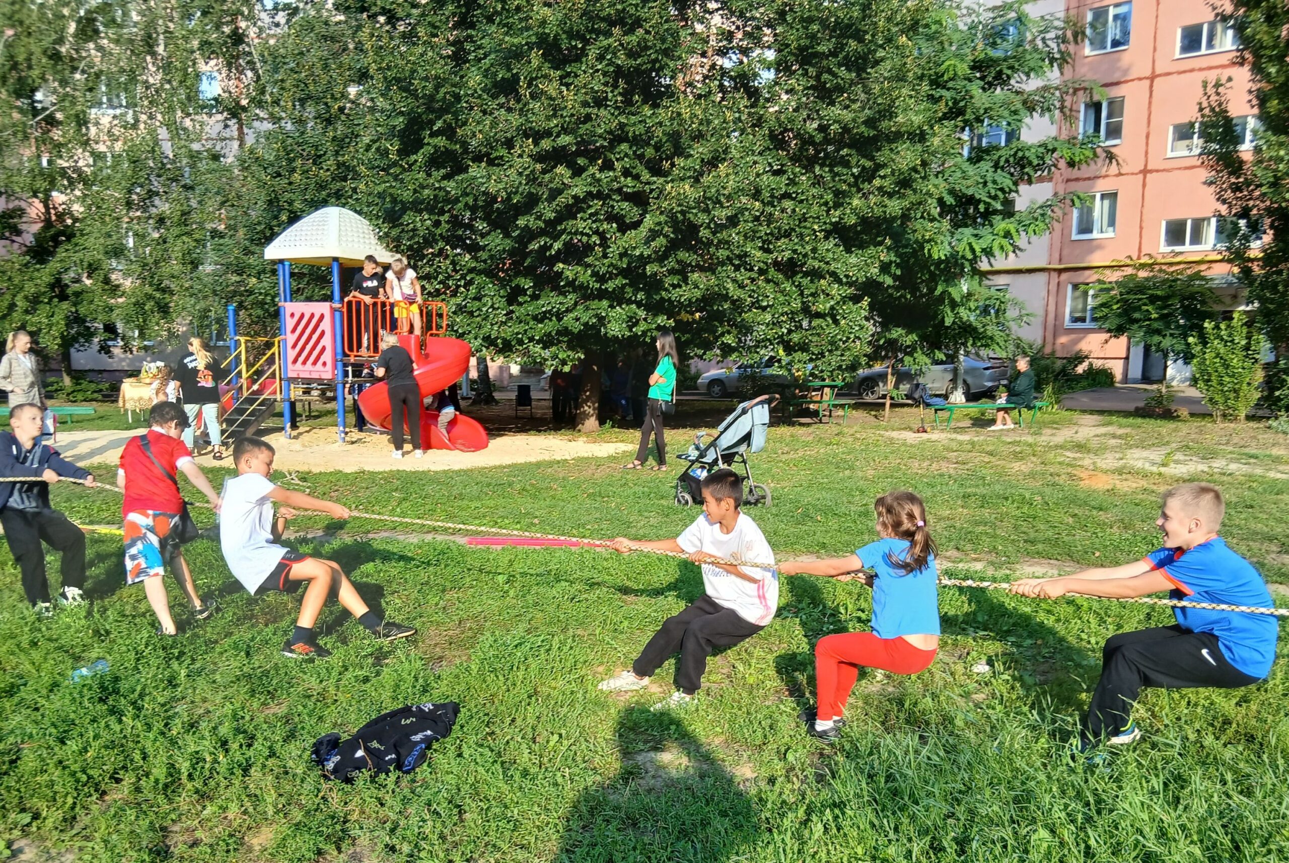 Одно из мест, где прошла такая встреча, — двор дома на бульваре Энтузиастов, 2а. Тамбовчане пришли сюда целыми семьями. И пока взрослые с удовольствием смотрели концертные номера, мальчишки и девчонки перетягивали канат, играли с ростовыми куклами, танцевали под зажигательные песни.