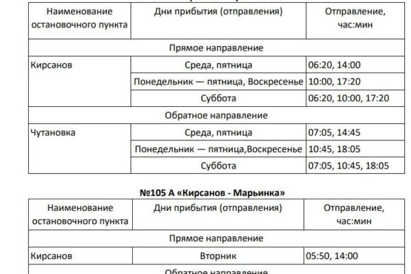 Как пояснили в администрации Кирсановского муниципального округа, с 17 ноября организация пассажирских перевозок по маршрутам «Кирсанов-Чутановка», «Кирсанов-Марьинка», «Кирсанов-Рамза» будет осуществляться по расписанию двумя автобусами. Маршруты будут разделены на три этапа.
