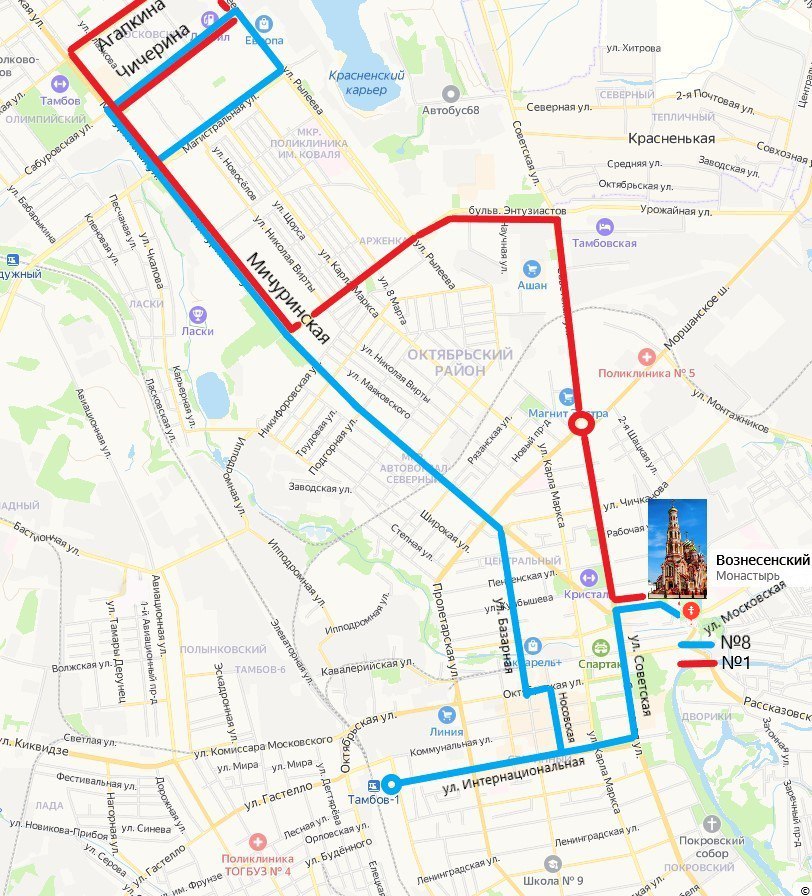 маршрут № 8 через железнодорожный вокзал на ул. Чичерина и маршрут № 1 с Московской по маршруту в направлении северной части города.
