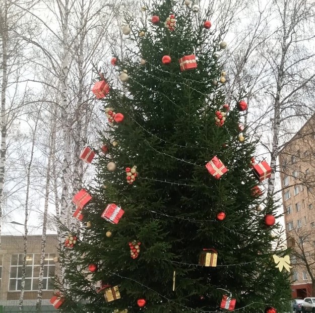 Открытки с новогодними желаниями вывешены на городских ёлках.