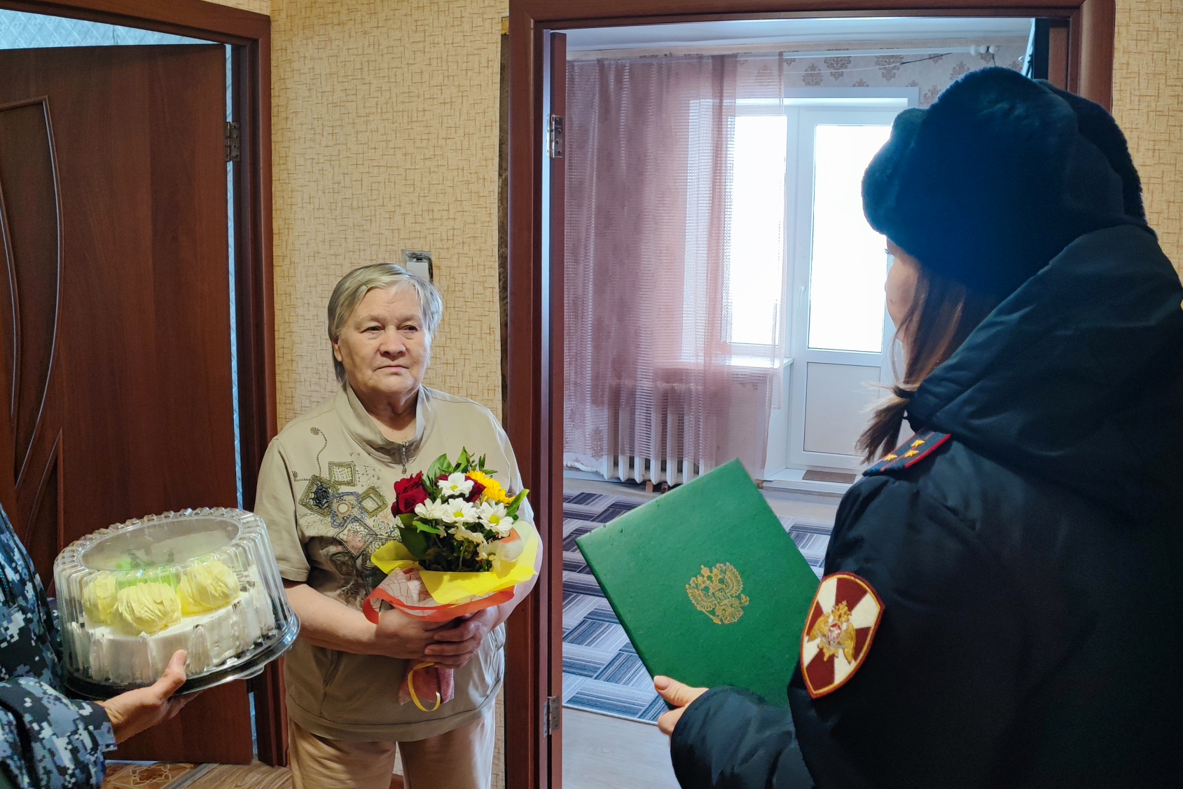 Росгвардейцы пожелали Надежде Васильевне крепкого здоровья, благополучия и вручили цветы и памятный сувенир.