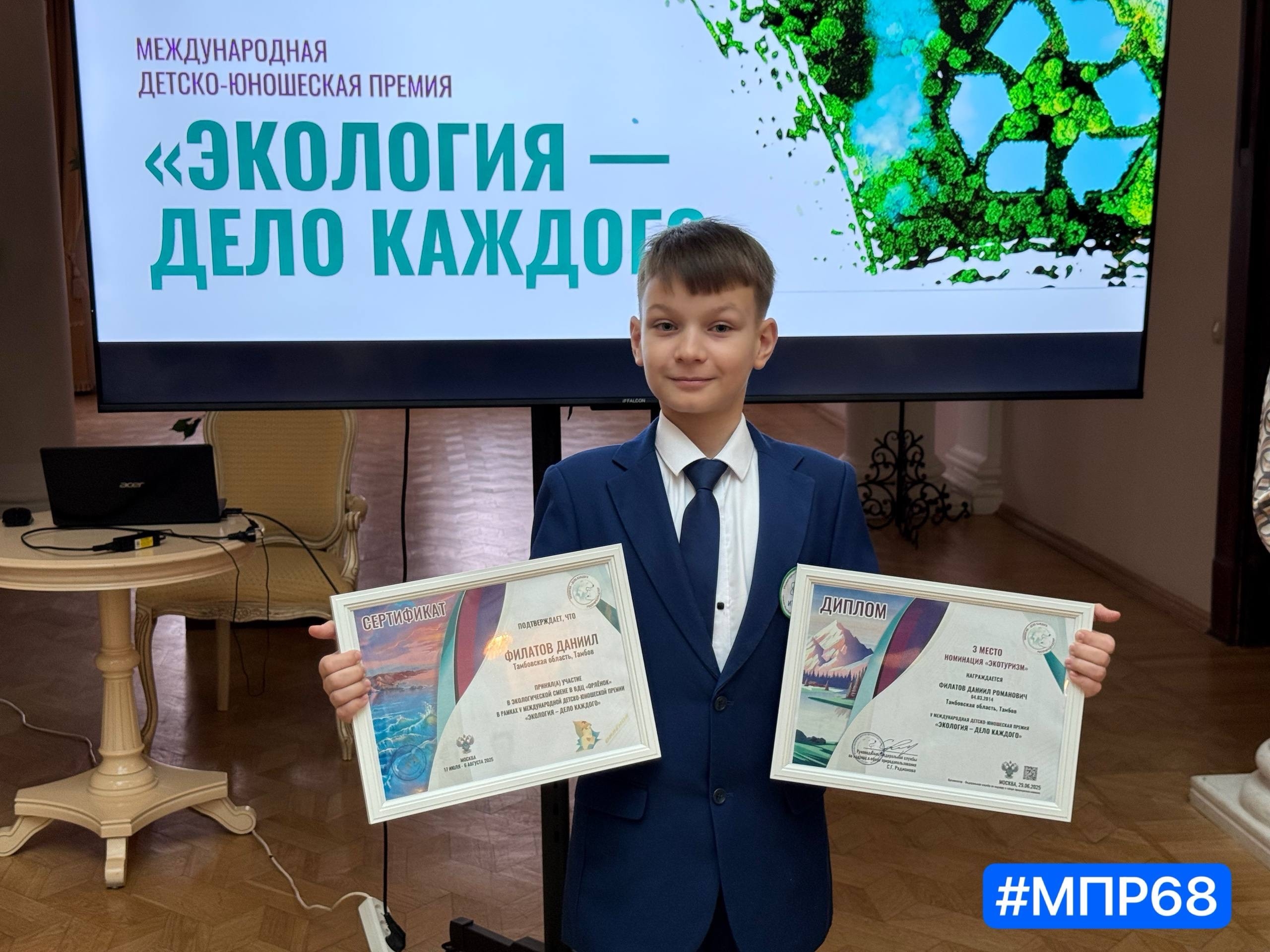 Обладателями награды стали тамбовчане, которые доказали, что вклад в сохранение окружающей среды может быть весомым в любом возрасте. Даниил Филатов занял третье место в номинации «Экотуризм». В своей творческой работе «Путешествие в Этнопарк «Кочевник» Московской области» он рассказал об уникальном месте, где можно познакомиться с бытом, традициями и культурой различных кочевых народов разных стран.