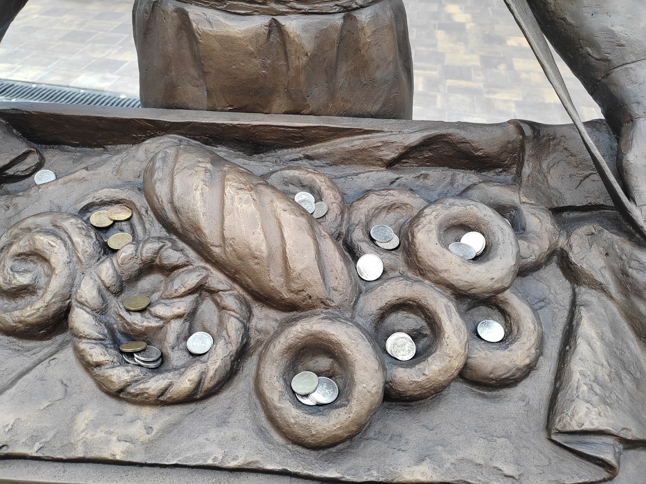 Монетки из желтого и белого металлов оставляют на подносе с выпечкой, который мальчик держит в руках. В городе уже зарождается легенда, что «покупка» у мальчика за монетку приносит удачу в торговле и помогает наладить дела.
