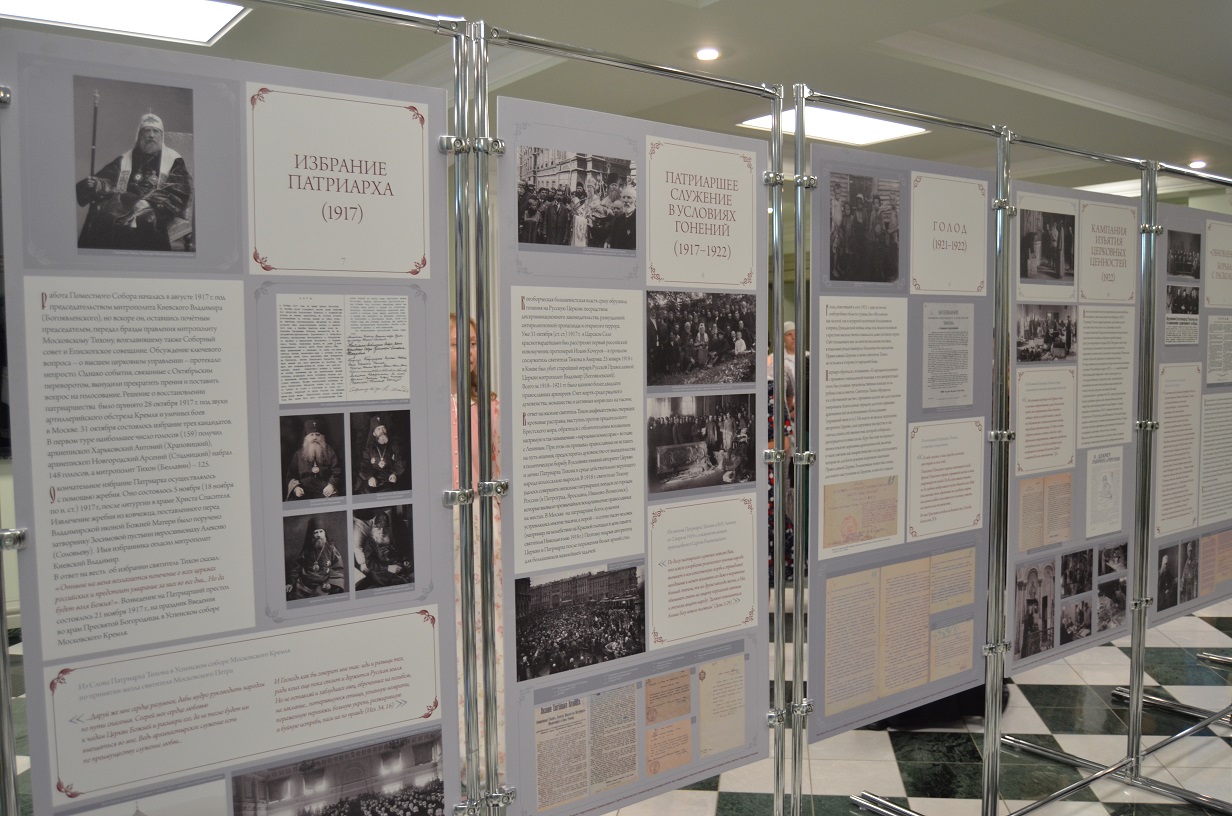 На стендах представлены фотографии, документы, выдержки из писем и цитаты подвижника.