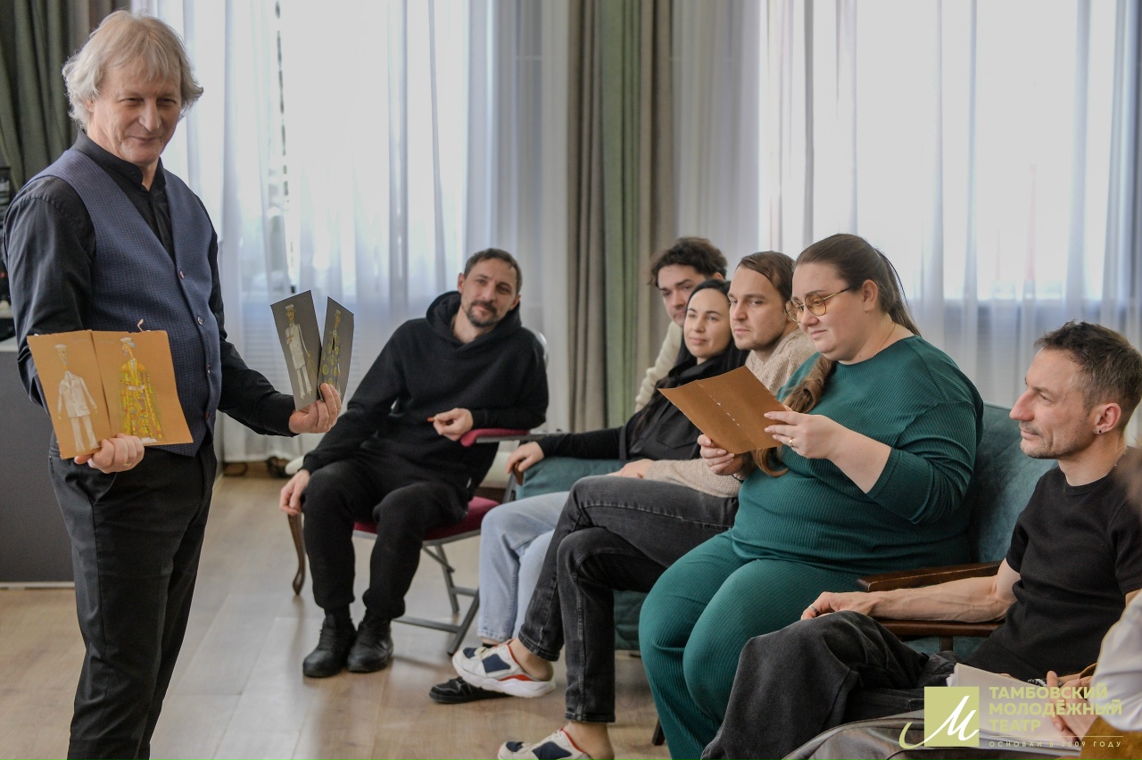 В читке принял участие художник спектакля Сергей Федоричев, известный зрителю своей работой в спектакле «Энергичные люди» режиссера Дмитрия Ефремова. Сергей представил артистам эскизы костюмов и декораций предстоящей премьеры.