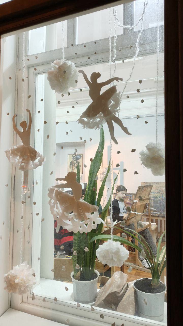 Каждый новый год преподаватели «художки» украшают окна школы по-новому. Вместе разрабатывают идею, вместе воплощают ее в жизнь. В прошлом году были зимние города, еще раньше – птицы и животные. Дизайн новогодних окон в этом году первая художественная школа Тамбова посвятила русскому балету.