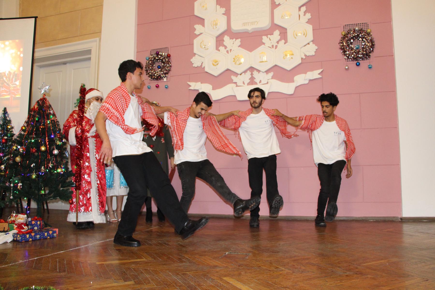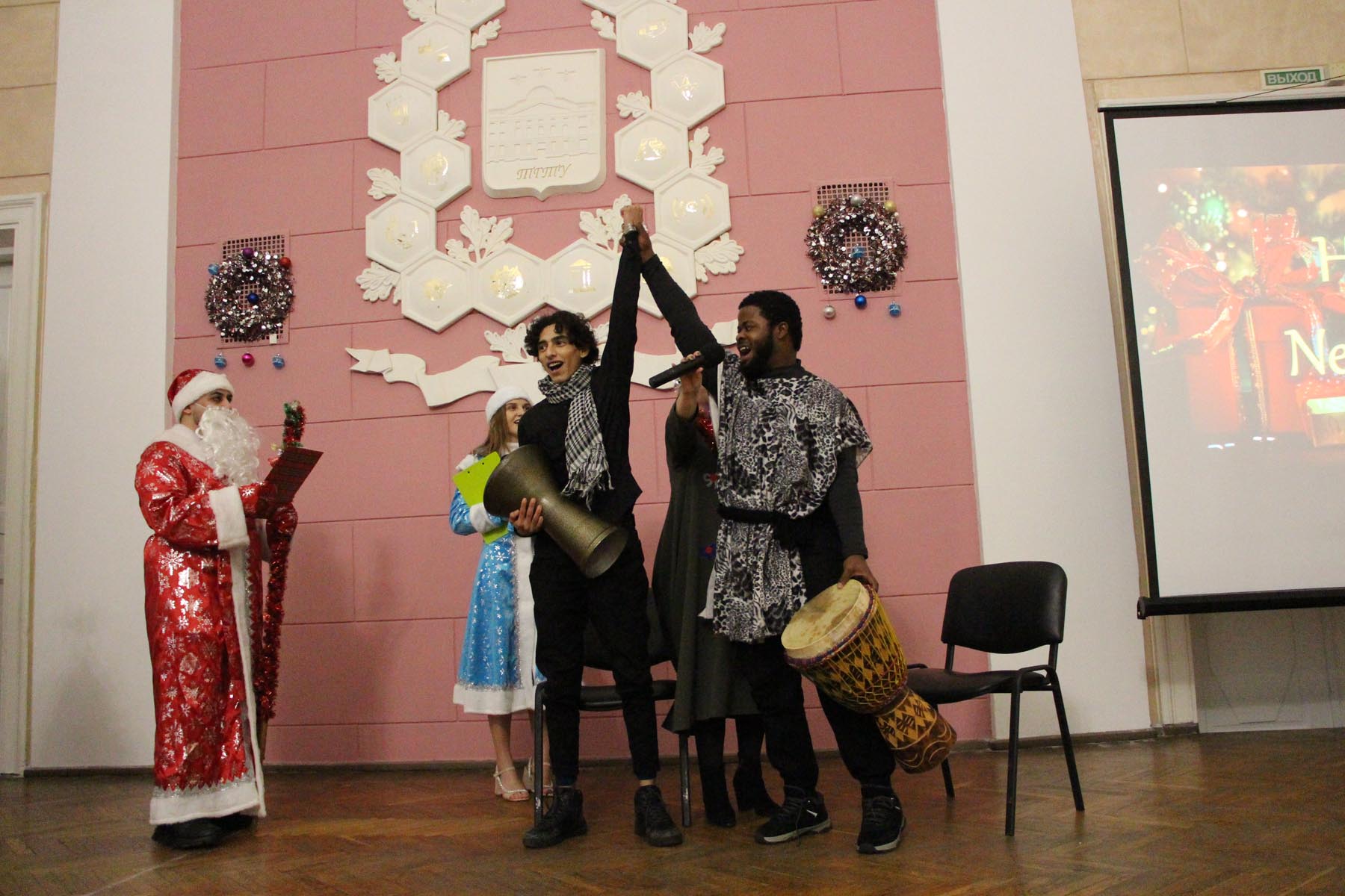 Ведущими праздника стали Дед Мороз Алмохаммед Мохаммед из Сирии и Снегурочка Дарья Давыдова из России. Дед Мороз отметил, что ему нравится русская зима, наши новогодние традиции, но он очень волнуется перед выходом на сцену в такой необычной для него роли. Студенты-иностранцы показали свои творческие номера: исполняли песни, национальные танцы, играли на музыкальных инструментах.