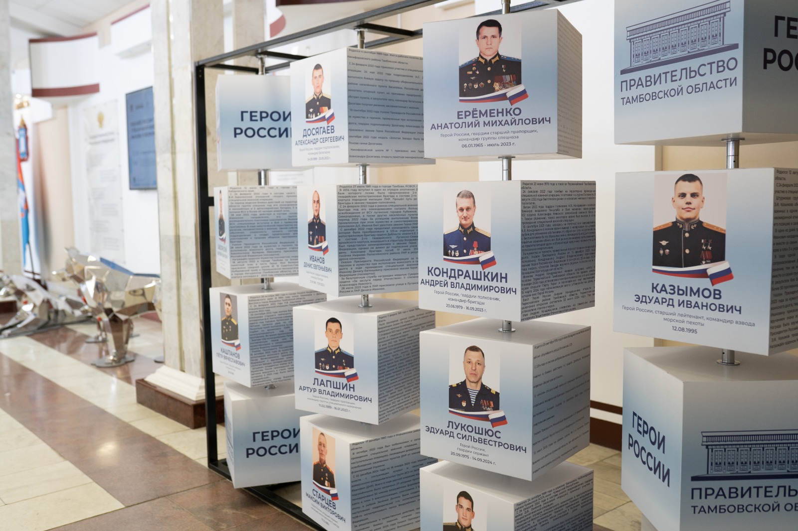 Открывает выставку стенд об одиннадцати Героях России — уроженцах Тамбовской области, проявивших мужество во время выполнения заданий в зоне проведения специальной военной операции. Это Александр Досягаев, Анатолий Еременко, Валерий Заволянский, Денис Иванов, Андрей Кондрашкин, Эдуард Казымов, Петр Каштанов, Артур Лапшин, Эдуард Лукошюс, Максим Старцев, Дмитрий Семенов.