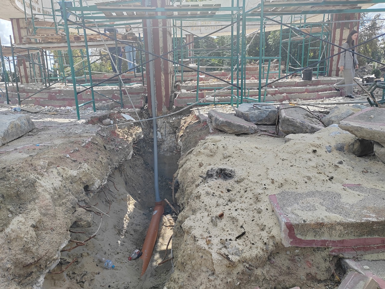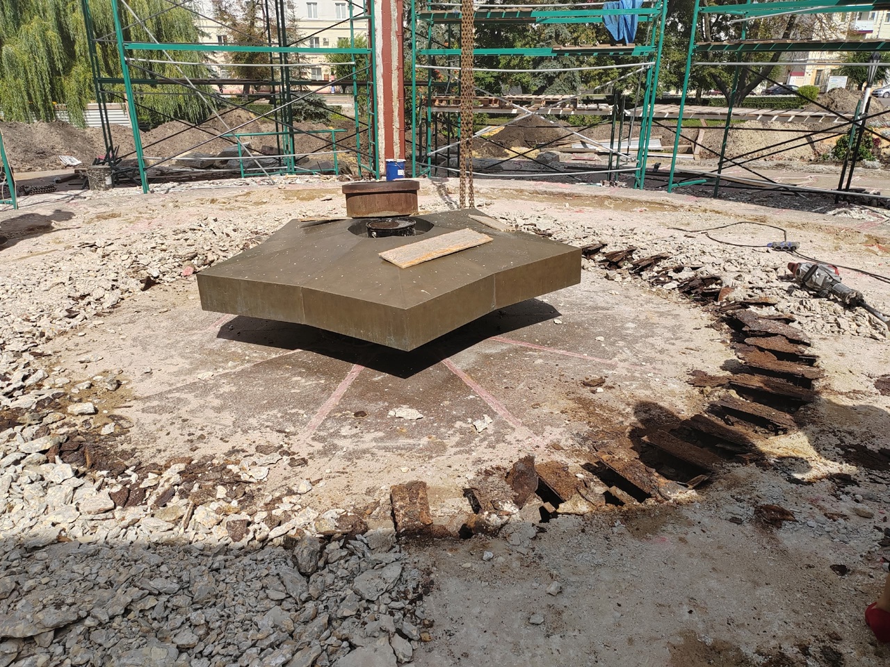 «На сегодняшний день специалисты уже демонтировали тротуарную плитку вокруг мемориала и подстилающие слои под ней, проложили траншею для инженерных коммуникаций, сняли кровлю кольца и подготовили стяжку под будущую кровлю и выполнили первый слой наплавляемого материала. Также подрядчик удалил стяжки между камнями стереобата и проводит демонтаж валунов, из которых состоят его ступени. В процессе реконструкции все камни вернутся на свои места после очистки», – рассказал заместитель генерального директора по развитию благоустройства Дирекции благоустройства и озеленения Владимир Левин.