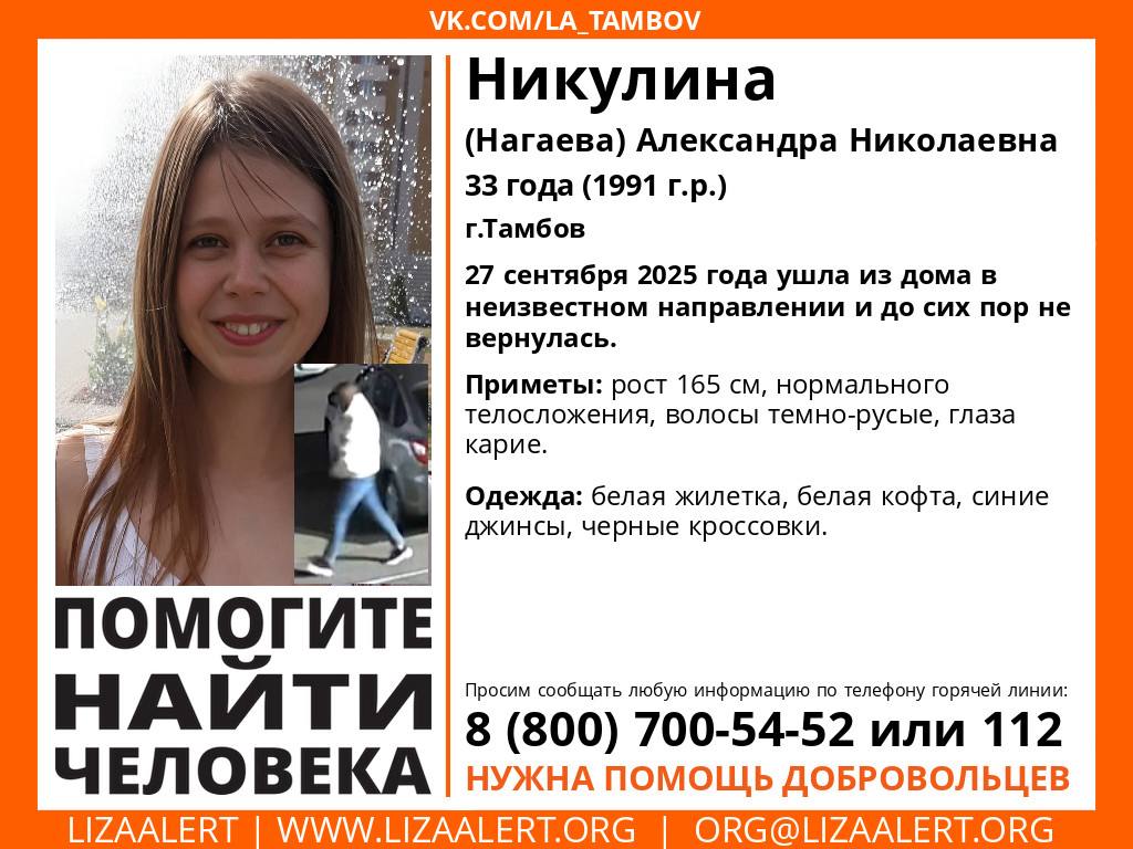 В Тамбове добровольцы «ЛизаАлерт» просят помощи в поиске 33-летней Александры Никулиной. Молодая женщина ушла из дома 27 сентября, и до сих пор о ней ничего не известно.