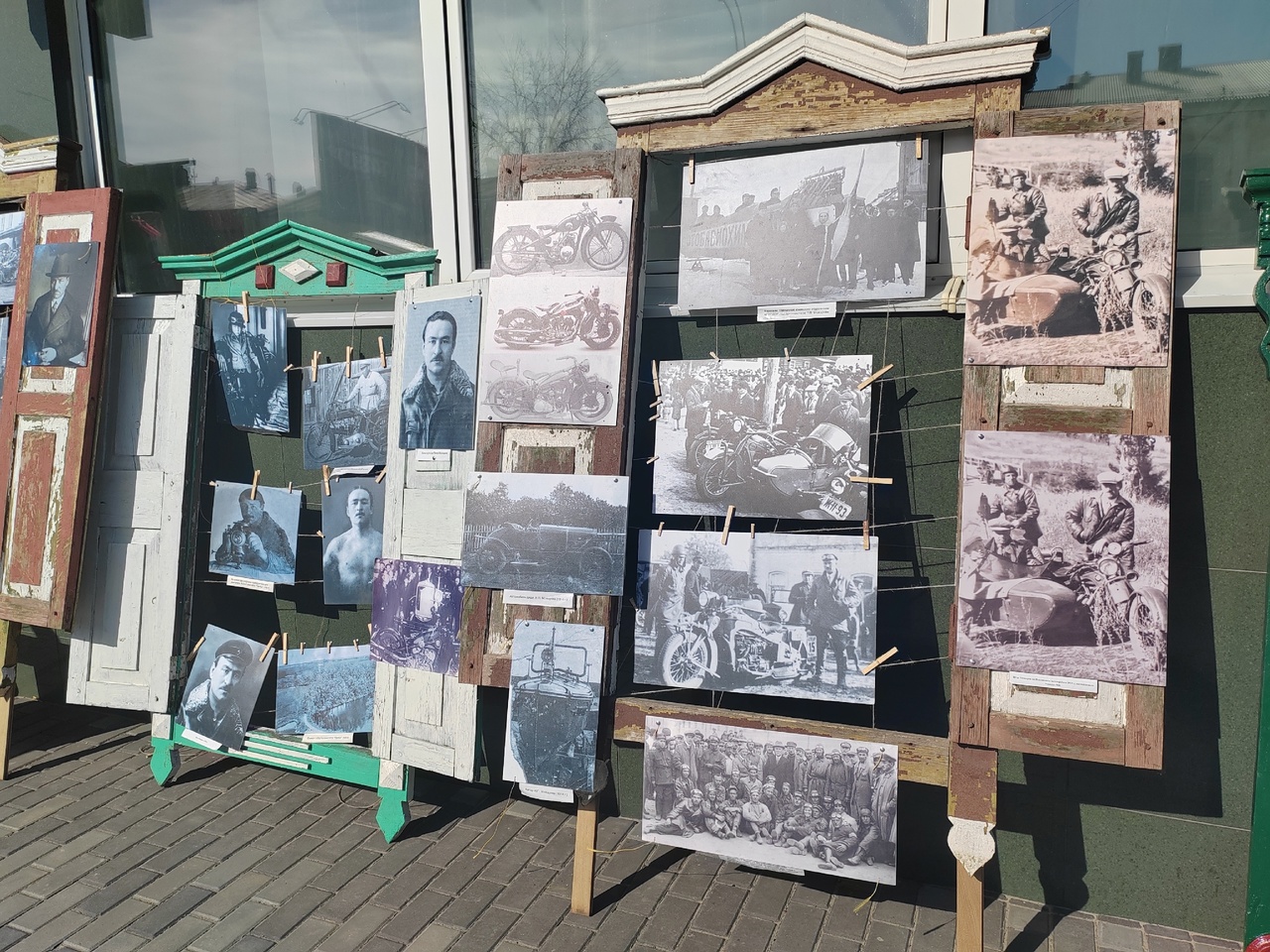 В течение дня на улице Коммунальной будет работать выставка копий снимков, сделанных Петром Можаровым, и фотографий, на которых он изображен. Разместили их креативно – на деревянных оконных на наличниках.