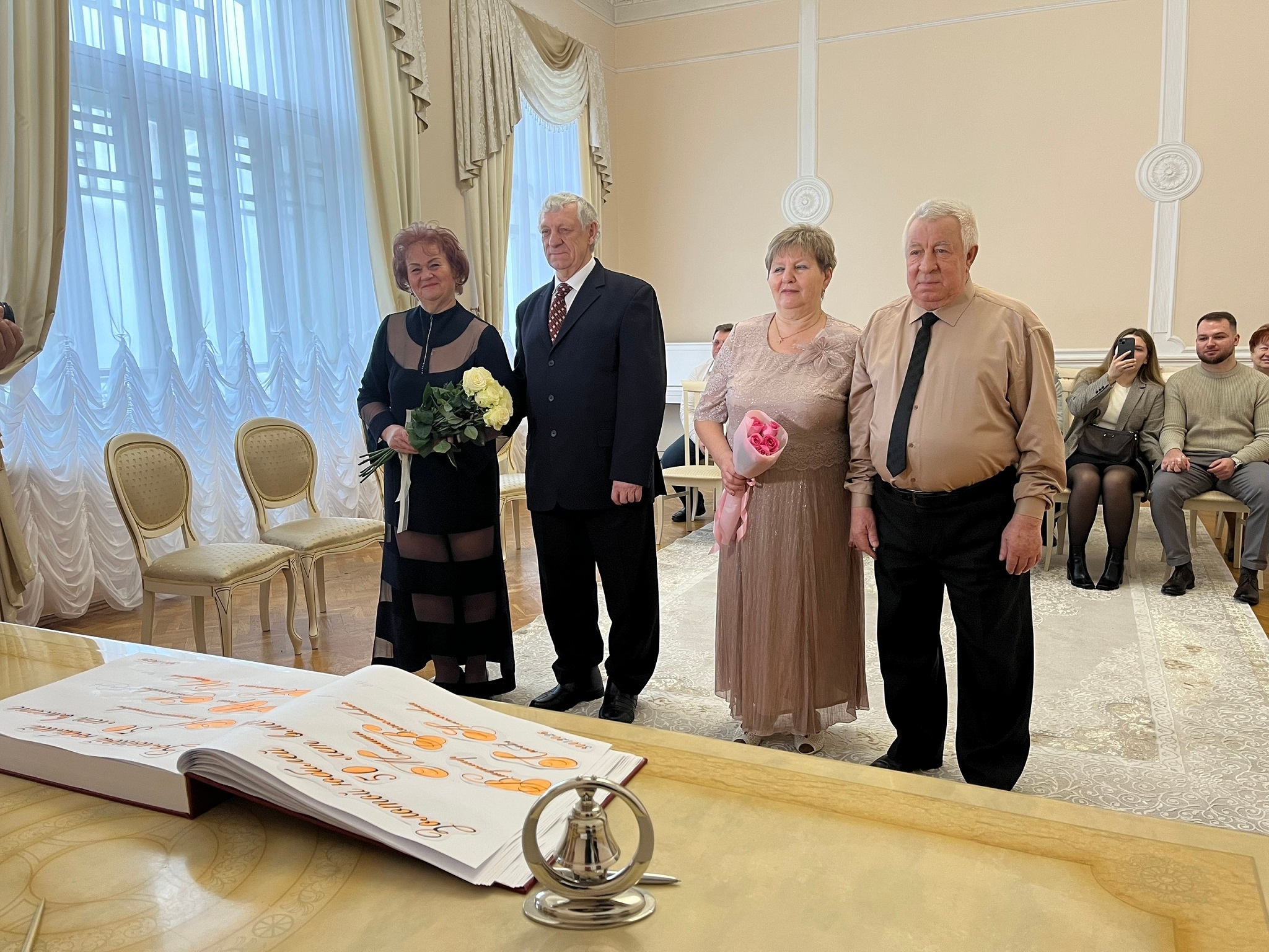 В Тамбове сразу две семейные пары отметили золотую свадьбу. Виновников торжества – супругов Константиновых и Мачалиных – поздравили сотрудники городского управления ЗАГС. Золотым юбилярам вручили поздравительные адреса от имени главы администрации города Тамбова Максима Косенкова.