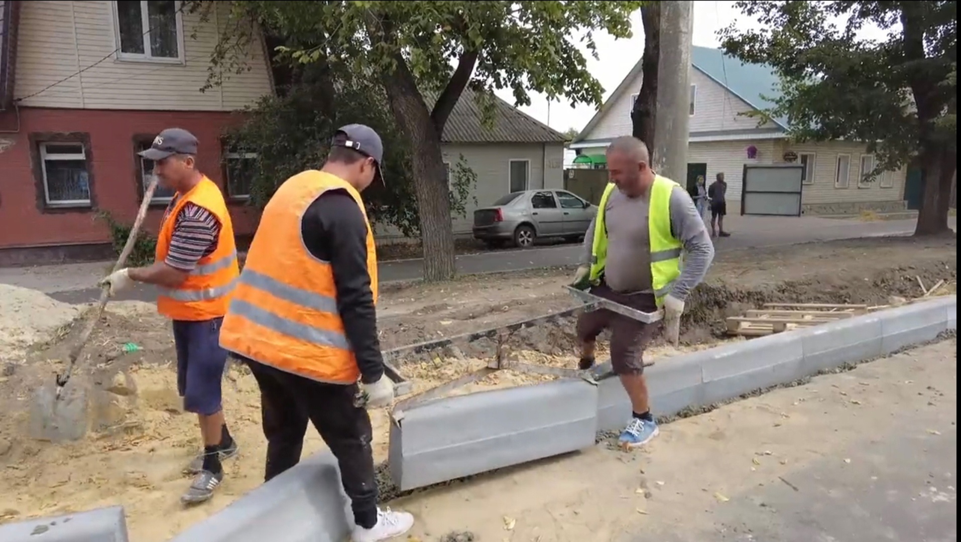 Вдоль проезжей части устанавливают новые бордюры.