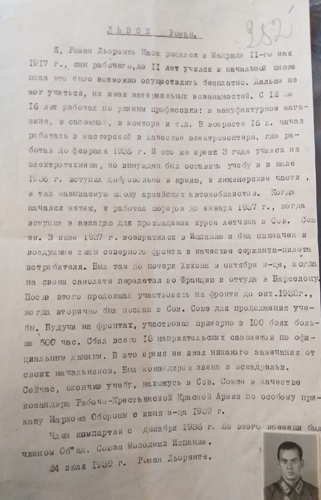 «О дальнейшей судьбе Льоренте – это его настоящая фамилия – мы знаем из краткой автобиографии, – добавляет Елена Валатина. – В 36-м году Льоренте уходит добровольцем в республиканскую армию Испании, в инженерные войска, так называемую школу автомобилистов. Поначалу служит обычным шофером, а с января 37-го поступает в ряды воздушных сил. Вскоре его направляют в Советский Союз в военную школу летчиков, успешно окончив которую, он в качестве летчика-истребителя вновь сражается с фашистами на всех фронтах Испании: принимает участие не менее, чем в ста боях. По официальным данным, сбивает 18 фашистских самолетов. Общий налет Львова к концу 1938 года составил более 500 часов. В августе 1938 года республиканское правительство вновь направляет Льоренте в СССР. После окончания курсов в Липецкой военной школе был откомандирован в Тамбовскую школу летчиков гражданского воздушного флота как пилот-инструктор. В 40-м году принимает гражданство СССР и меняет фамилию на русскую – с этого момента Льоренте становится Романом Львовым. С сентября 1941 года его направляют в 785-й истребительный авиационный полк ПВО Тамбова командиром эскадрильи истребителей, и он защищает тамбовское небо от фашистских стервятников. Затем в составе этого полка воюет на Брянском, Воронежском и Калининском фронтах до октября 1943 года. За боевые заслуги Роман Романович Львов награжден Орденом Красной Звезды. После войны он служит в гражданской авиации. Известно, что Льоренте был женат на уроженке города Козлова Раисе Мухортых. Возможно, удастся отыскать кого-нибудь из родственников».