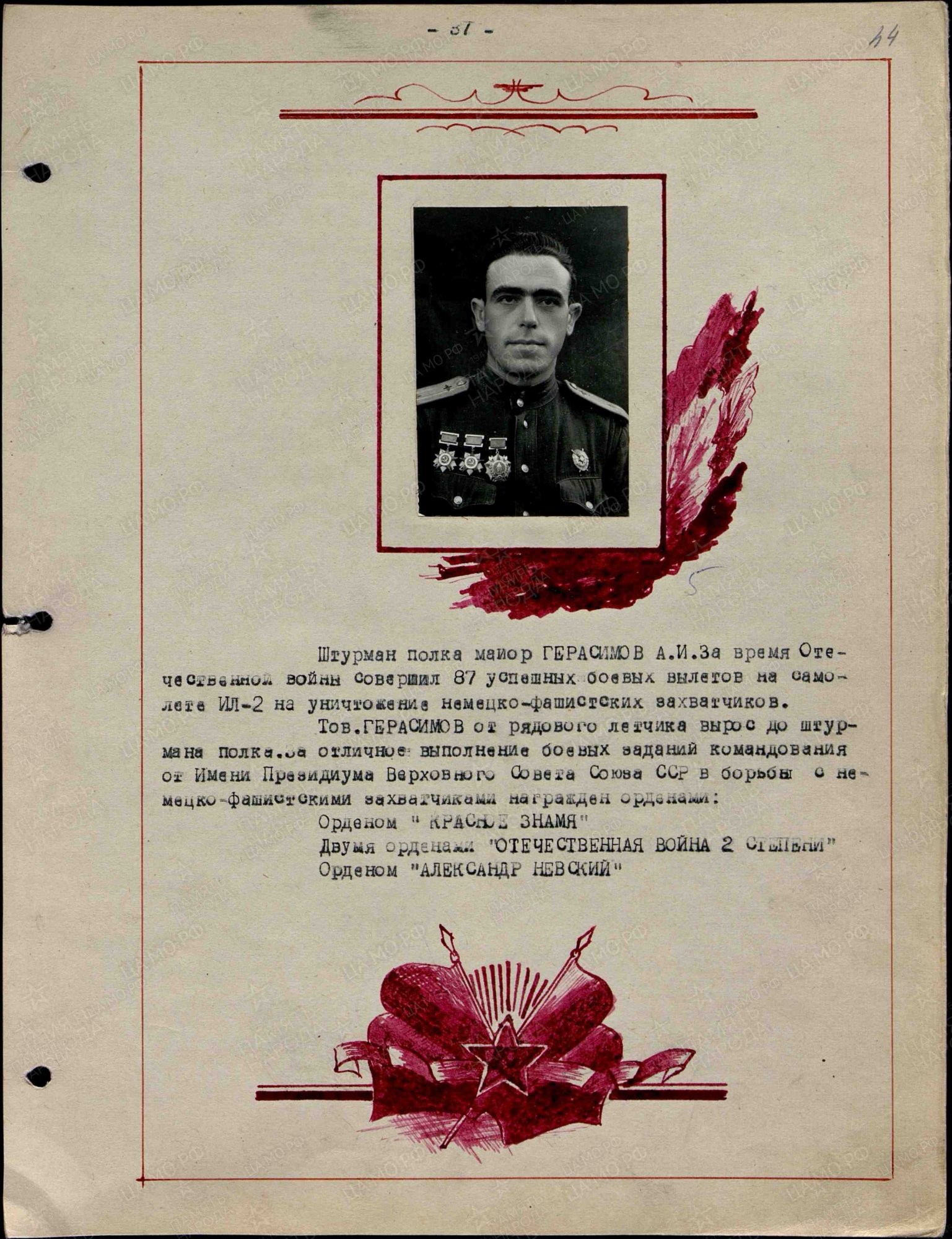 Воевал Герасимов, как и его соотечественник, Ансельмо Сепульведа – Арсений Седельников, в 208-м штурмовом авиационном полку. В составе полка вылетал на штурмовку врага под Сталинградом, Харьковом, на Курской Дуге и Житомире. За годы войны совершил 119 боевых вылетов.
