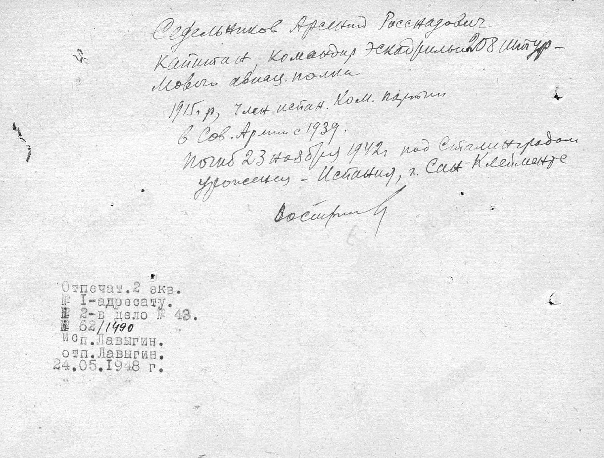 Осенью 1941 года он добровольцем уходит на фронт. Получает направление на службу в 208-й штурмовой авиационный полк, который в это время базировался в Тамбове, здесь же происходило доукомплектование и переучивание на новые типы самолетов. В ноябре полк был переброшен под Сталинград. В одном из боевых вылетов летчики обнаружили колонну танков противника. Ансельмо и его товарищи на бреющем полете нанесли по танкам бомбовый удар. Из этого боя капитан Ансельмо Сепульведа – Арсений Седельников не вернулся.