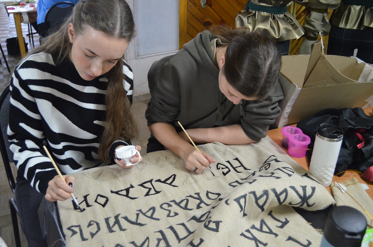 Студенты собираются по вечерам, в свободное от учебы время. По самим мастерам видно, что внешний вид для них имеет не последнее значение, некоторые даже подобрали для себя яркий, эффектный образ. Кажется, царит суета, но каждый занят своим делом. Одни вместе с наставницей обступили манекен, на котором формируют лиф, другие примеряют детали костюмов, третьи обговаривают между собой порядок действий. Там рукодельницы плетут украшения из бисера, рядом – крепят картонные детали на китовый ус, а наискосок – наносят буквы уставного письма на полотно, которое потом превратится в штаны, юбки и рубахи.