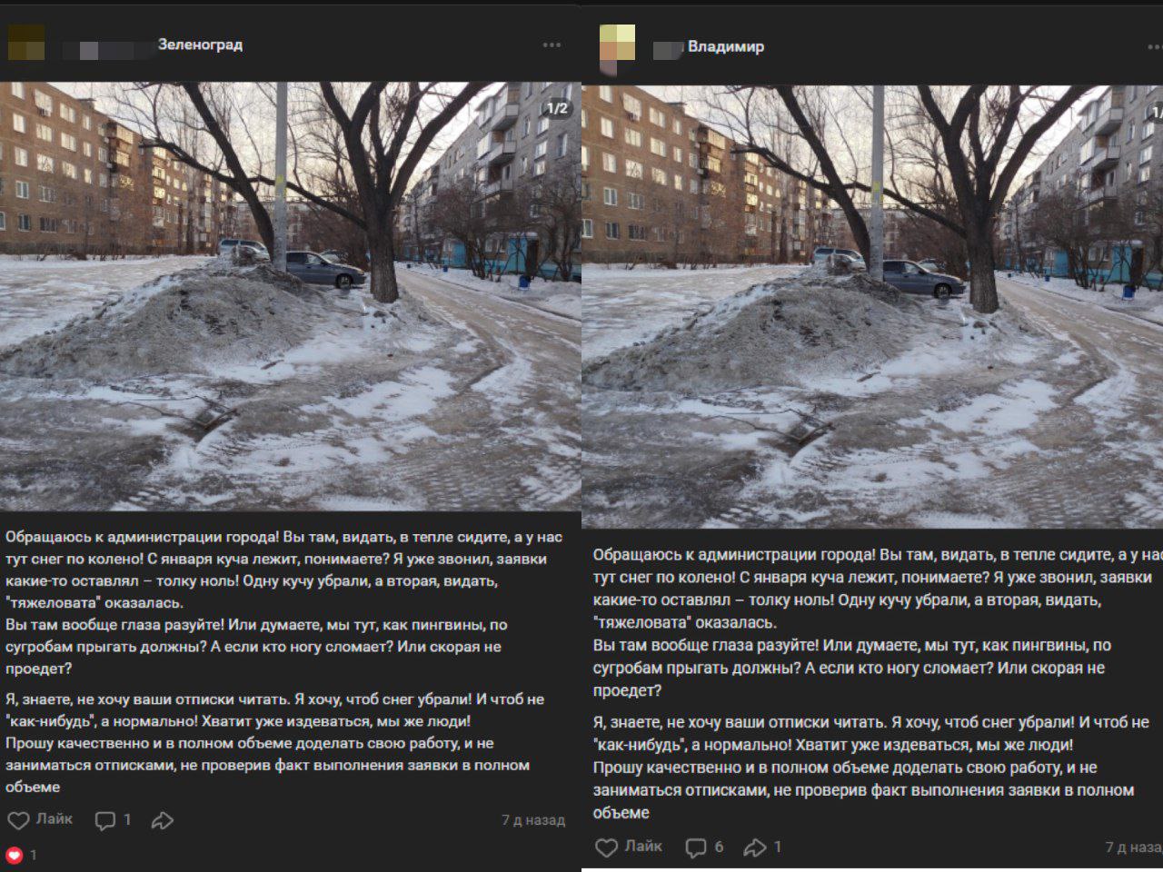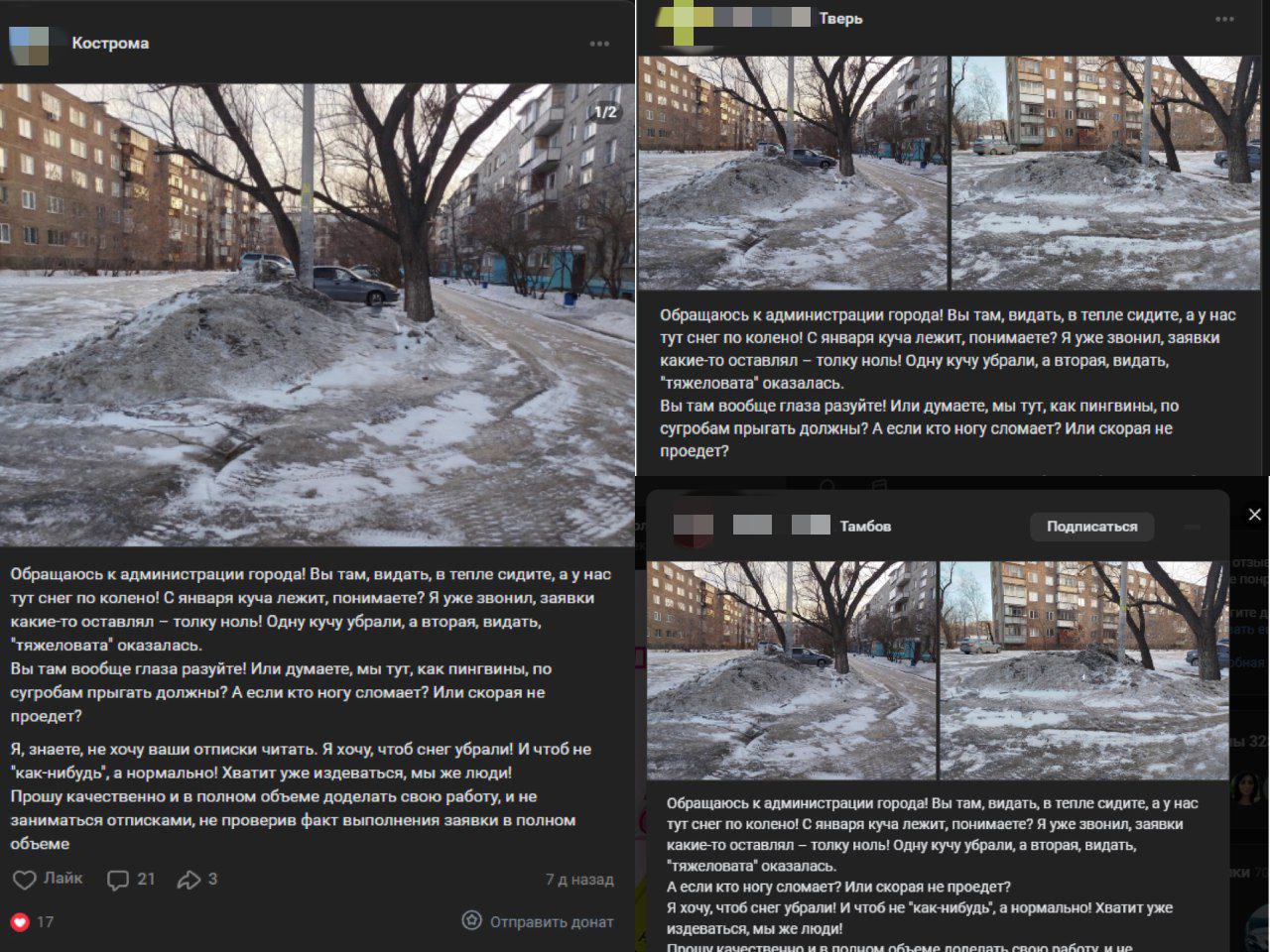 На фото – типичная многоэтажка. Таких по всей стране, практически как в фильмах Эльдара Рязанова, тысячи… И пошло бы все по классической схеме с тысячами гневных комментариев, если бы не пресловутый снег, упомянутый выше. Тамбову в этом году с ним не везло. Тамбовчане это сразу отметили, и дискуссия закрылась, так и не начавшись. Но! Точно такой же пост одновременно был опубликован в региональных пабликах сразу по всей стране. Тамбов, Тверь, Кострома, Муром и так далее. Это заметил бдительный пользователь некий Владимир Владимирович, разместив ссылки на новости из других регионов. Кто успел прочесть, на фейк не повелись, но в городах, где зима оказалась снежной, комментаторы «закипели» со всеми вытекающими отсюда выводами и мнениями…