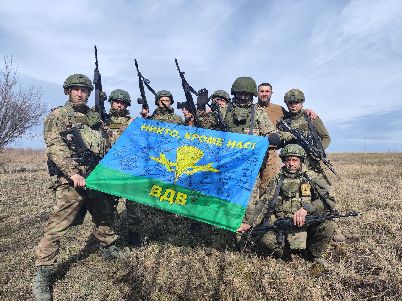 Кивком головы откидывая каску с глаз и улыбаясь во весь рот, подходит Сын. За ним подтягиваются еще несколько десантников. За огородами у них тренировочный полигон. Растягивают флаг, на котором все заранее расписались.