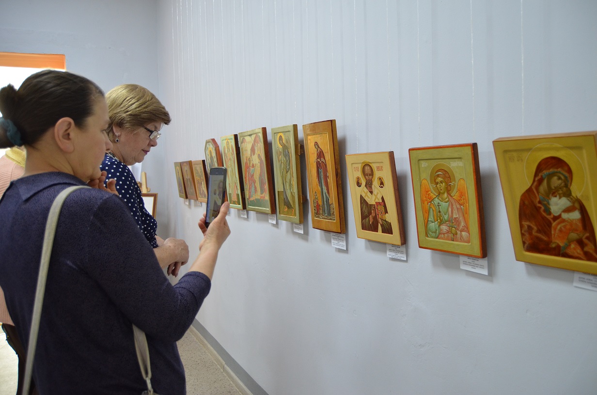 Всего в арт-холле библиотеки вывешено тридцать образов, созданных учащимися отделения иконописи и церковно-прикладного искусства Детской художественной школы №2 прикладного и декоративного искусства имени В.Д. Поленова и членами объединения тамбовских иконописцев «Къ Свету». Казалось бы, экспозиция скромная, но это цвет колоссальных трудов. Чтобы овладеть искусством иконографии, человеку требуется десять-пятнадцать лет непрерывной практики. Почти столько же по времени продолжается процесс создания иконы: доска выдерживается восемь лет, две-три недели уходит на ее грунтовку, затем накладывается сусальное золото, двенадцать-пятнадцать тончайших слоев яичной темперы, дающих эффект внутреннего свечения, и, наконец, лаковое покрытие.
