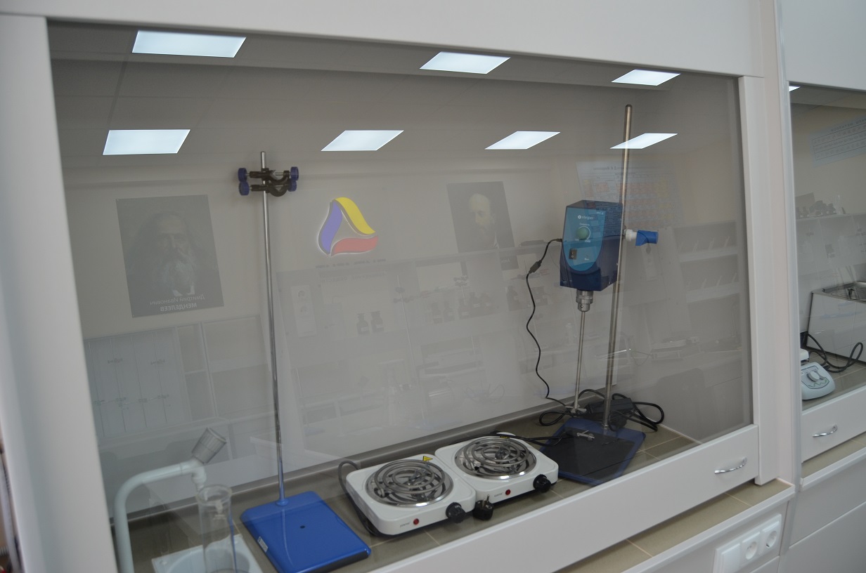Подобрана удобная функциональная мебель. Соответственно тематике помещения оформлен интерьер: на виду периодическая система элементов Менделеева и другие необходимые таблицы. Портреты ученых Д.И. Менделеева и А.М. Бутлерова призваны вдохновлять на покорение вершин.