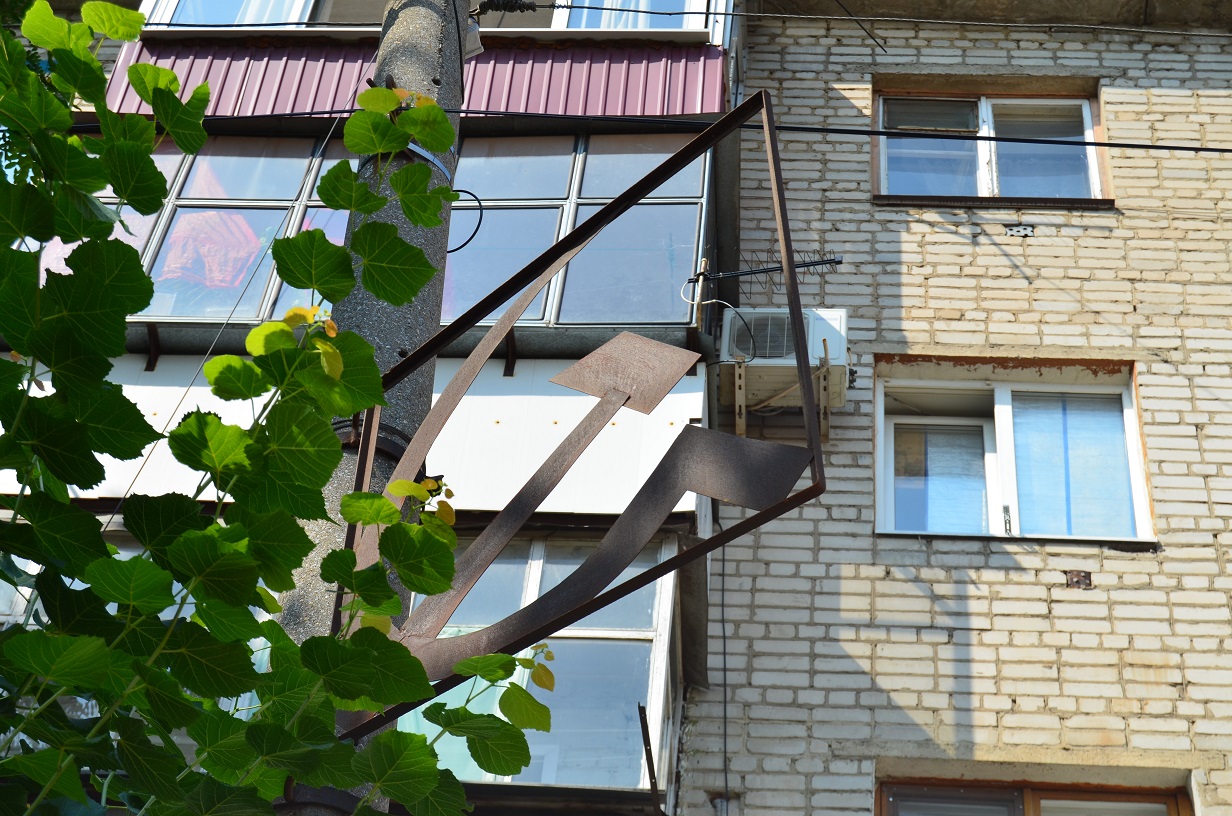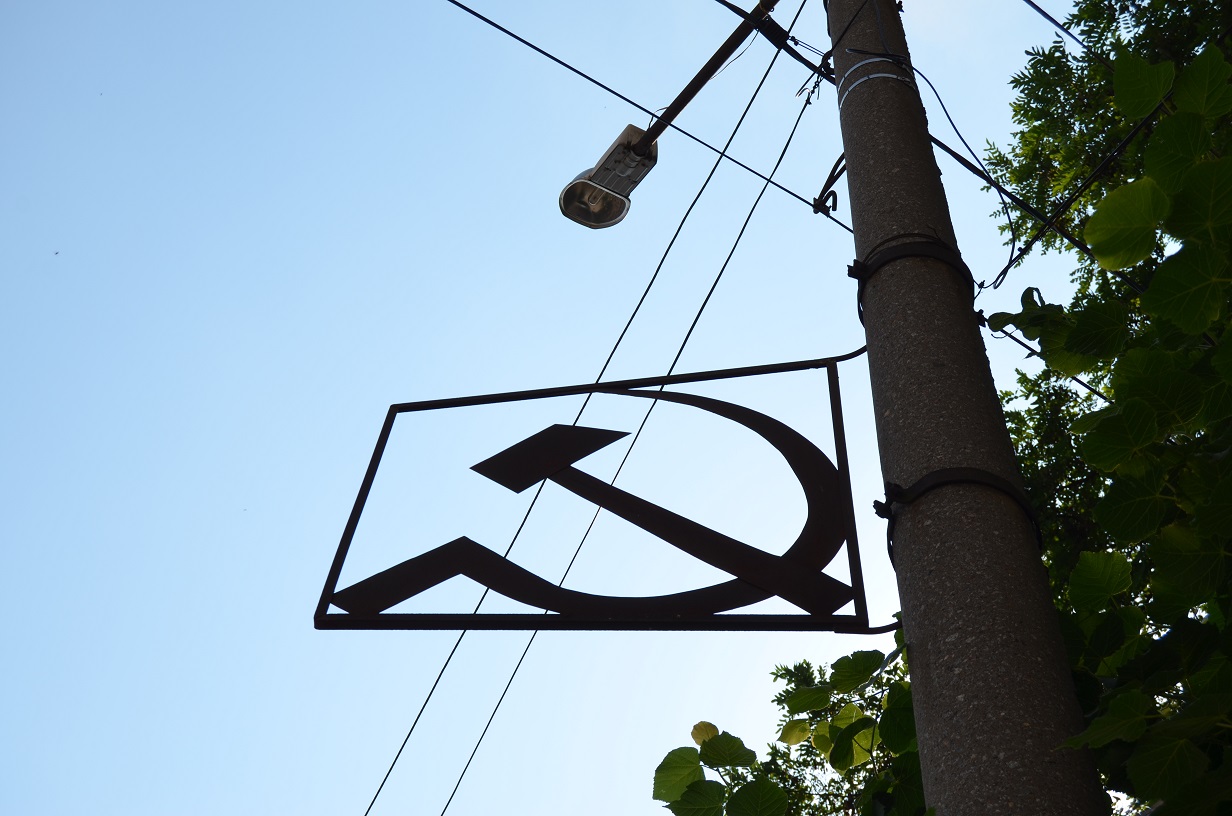 На одном из столбов улицы Железнодорожной, у самой Привокзальной площади, сохранился элемент государственной символики Советского Союза – металлический знак «Серп и молот». На то, что это дань памяти и уважения к прошлому, нет и намека: знак проржавлен и почти скрыт листвой.