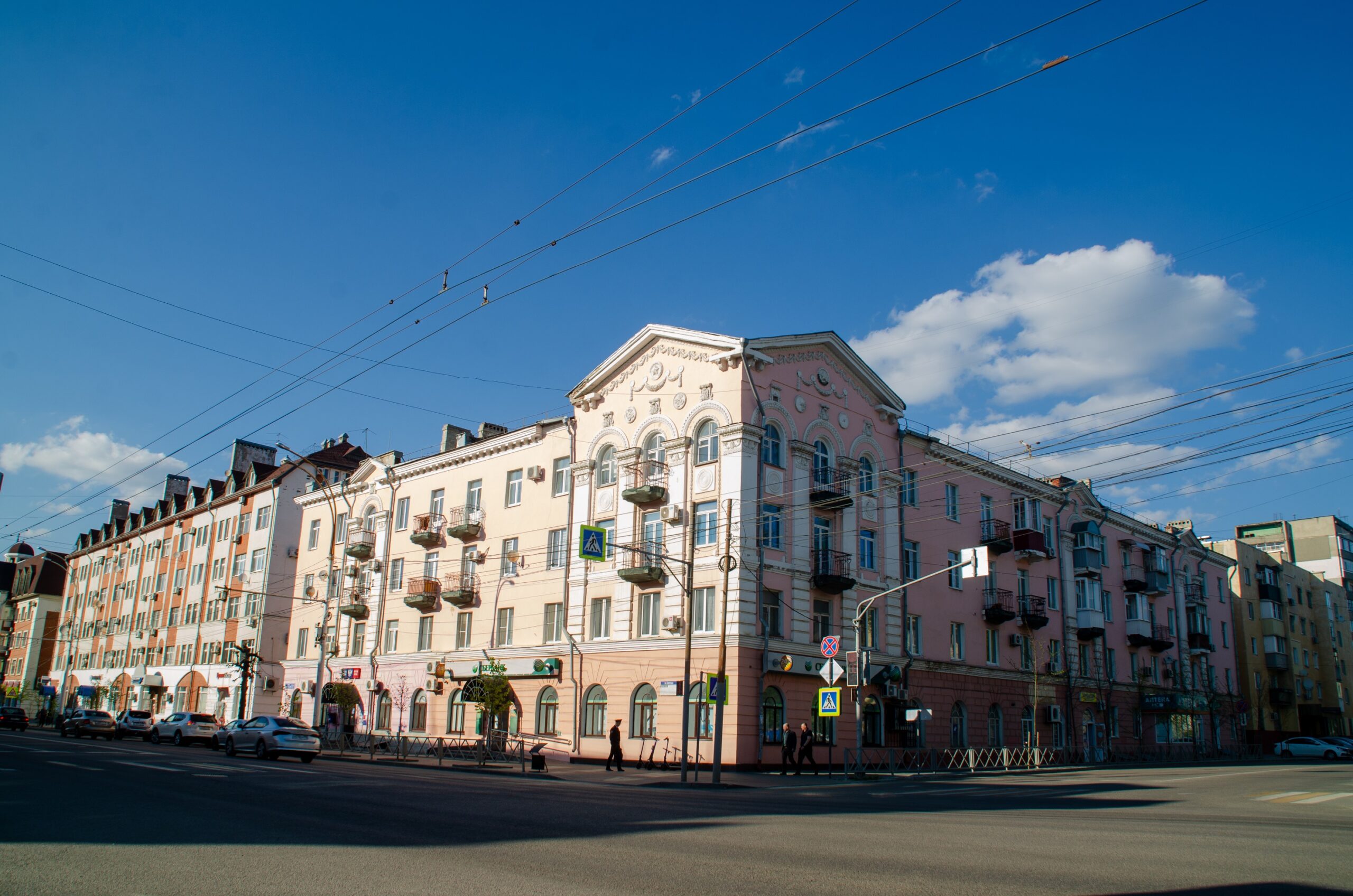 «Четырехэтажное здание с небольшими угловыми надстройками в форме башенок и богато украшенной лепниной выстроено в стиле советского ампира. По фасаду видны балкончики с ажурной ковкой ограждения. Поверху украшено треугольными портиками и красивым лепным кровельным карнизом», – отметил Денис Силин.